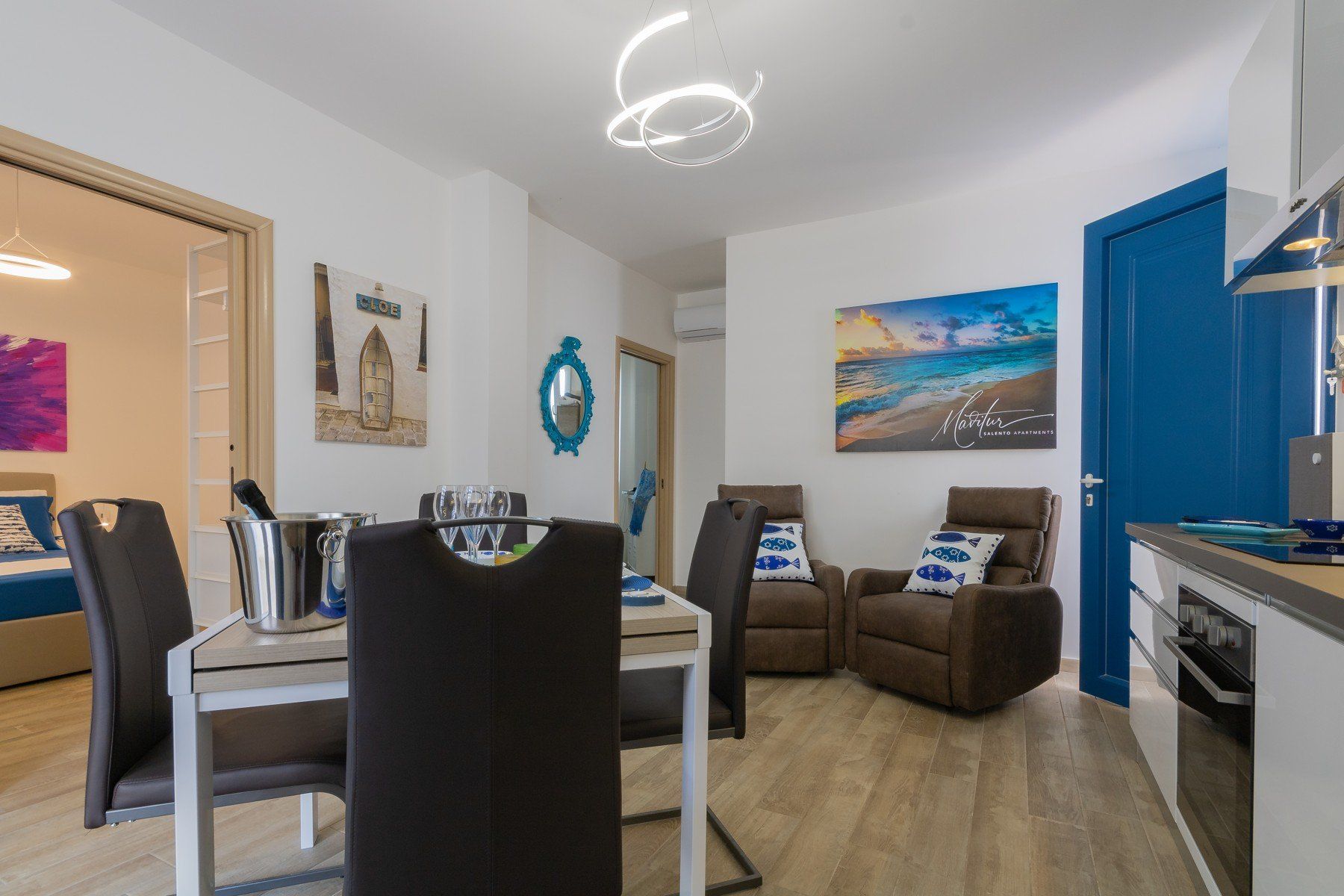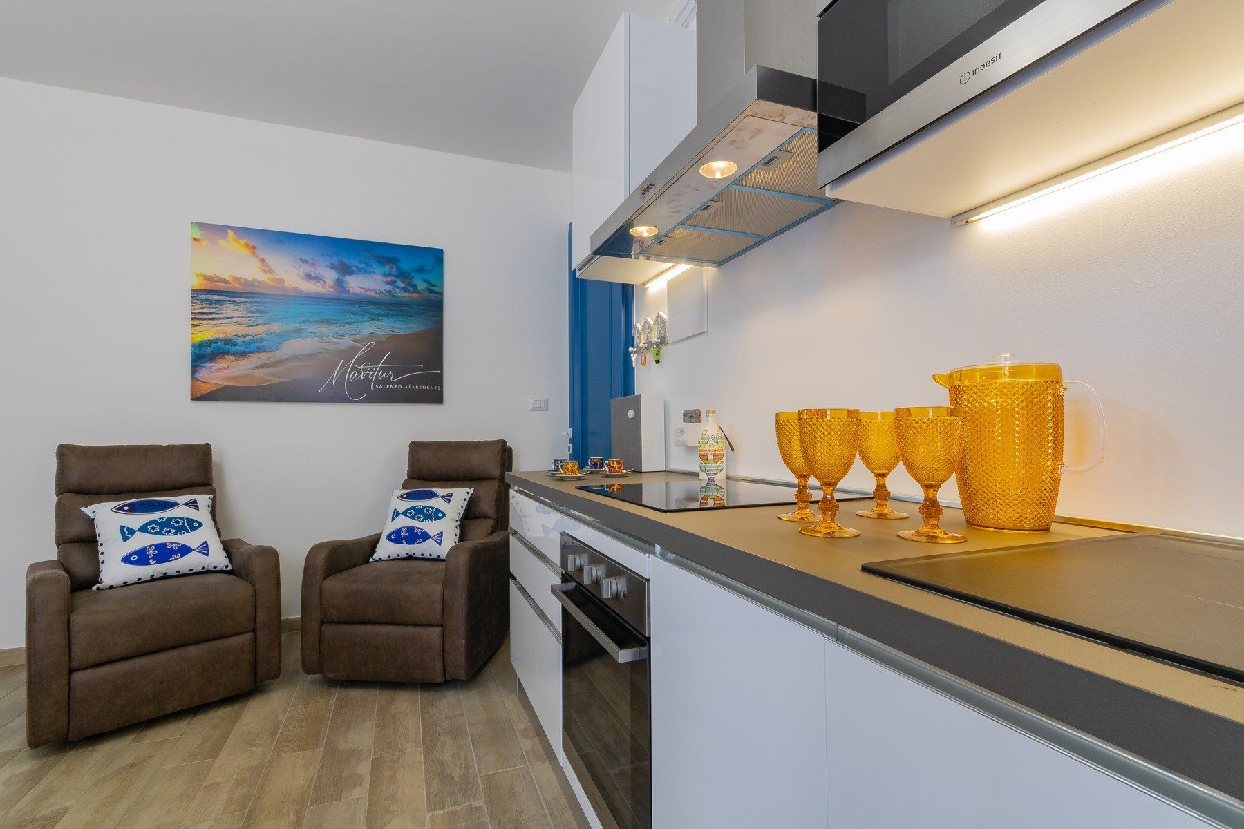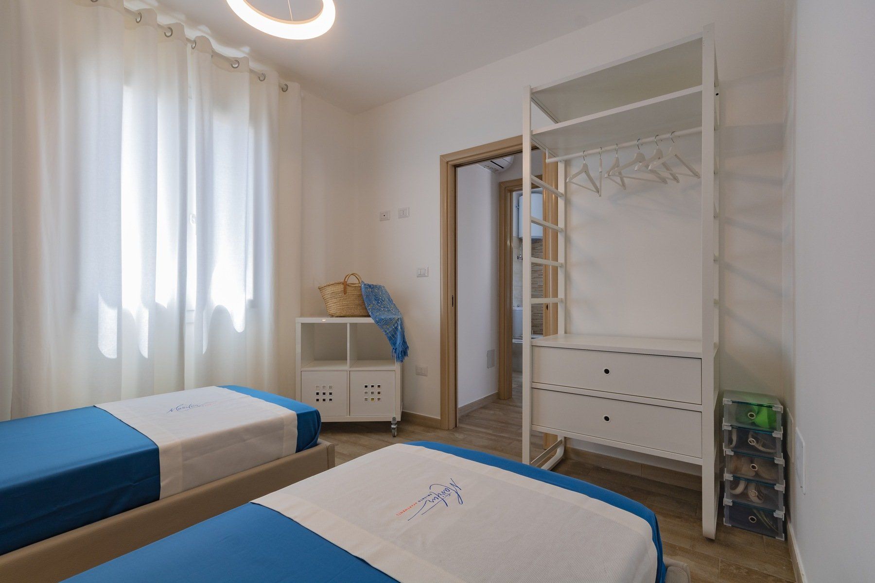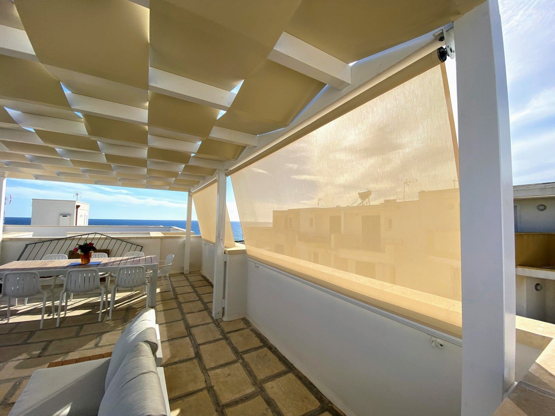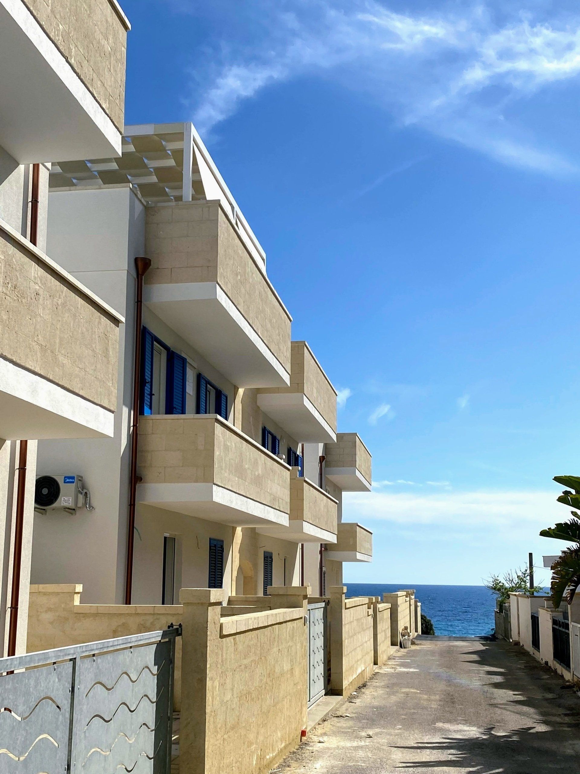 We offer for rent sea view apartments finely furnished with every comfort, two bedrooms, living room with sofa bed and full kitchen, a bathroom with shower, private parking, air conditioning, 55 "TV and free WiFi located in front of Isola Pazze del Regional Natural Park of the Litorale di Ugento LE. A large solarium terrace with pergola and barbeque is available for guests upon reservation, where it is possible to sit at the table for up to twelve people and then sit in the shady relaxation lounge. The most beautiful beaches of the Sea Ionio are just a few minutes away both on foot and by car. Located 20 km from Gallipoli and 30 km from Leuca, the apartments offer maximum tranquility even when you prefer to stay at home to enjoy the sun and the sea equally. perimeter courtyard and from the first floor apartment with balcony it is possible to reach the living terrace and solarium. Check-in online before arrival on the Vikey platform to obtain the access link to the apartments via email and, during the stay, to book the solarium terrace via smartphone.