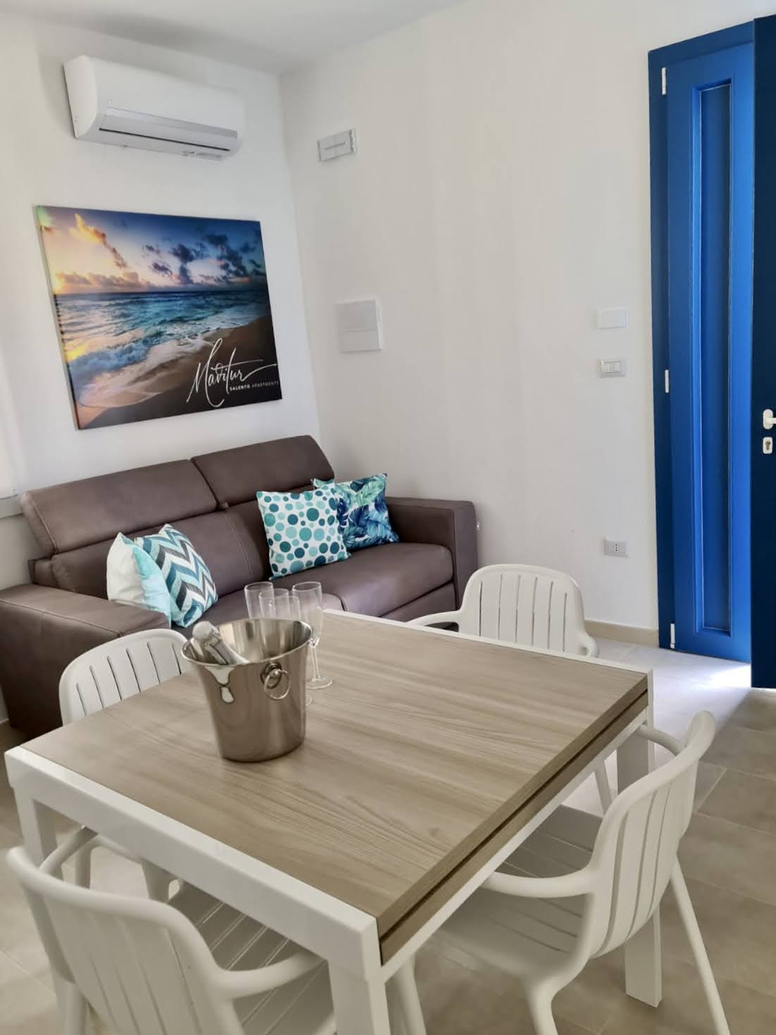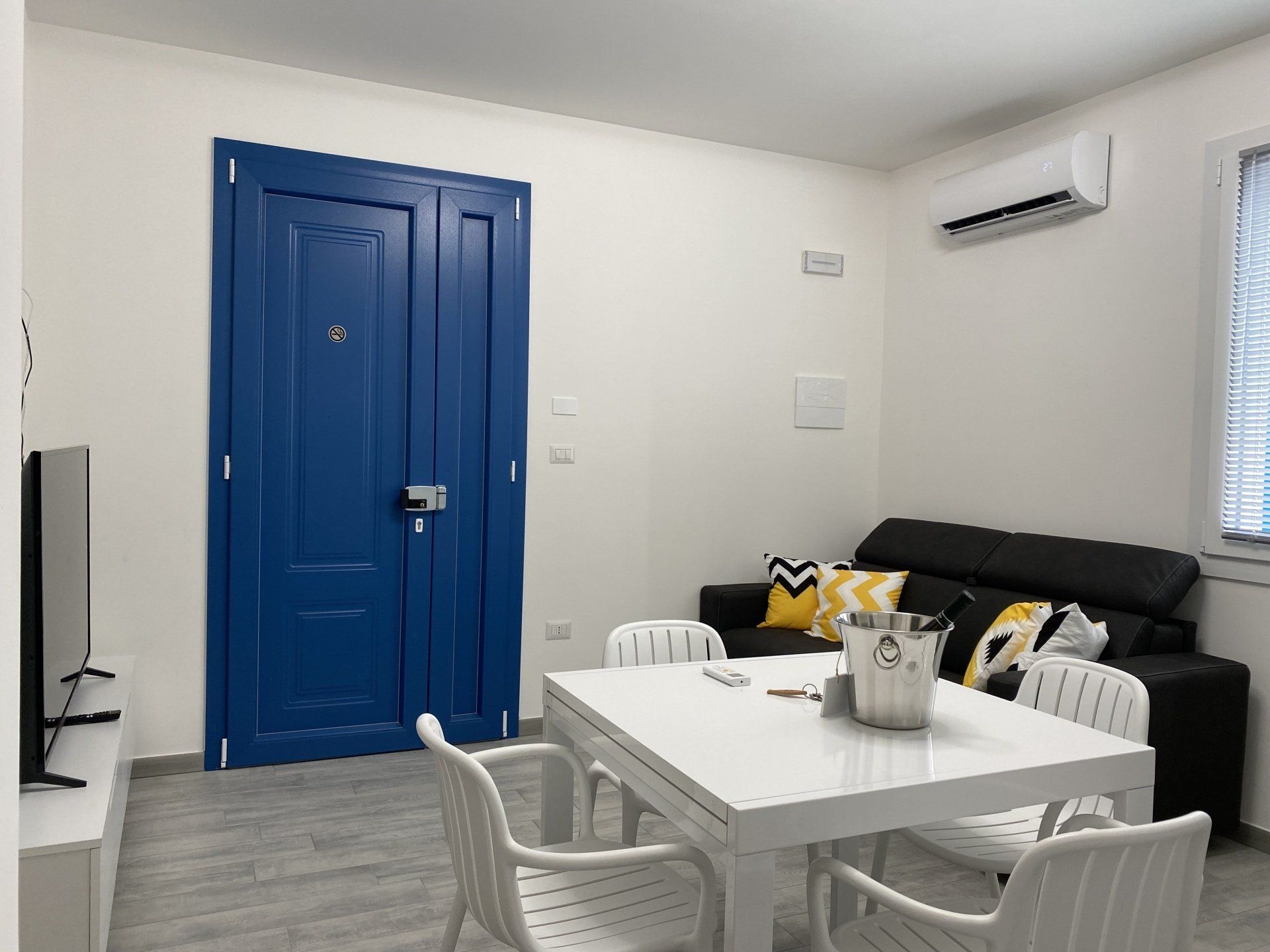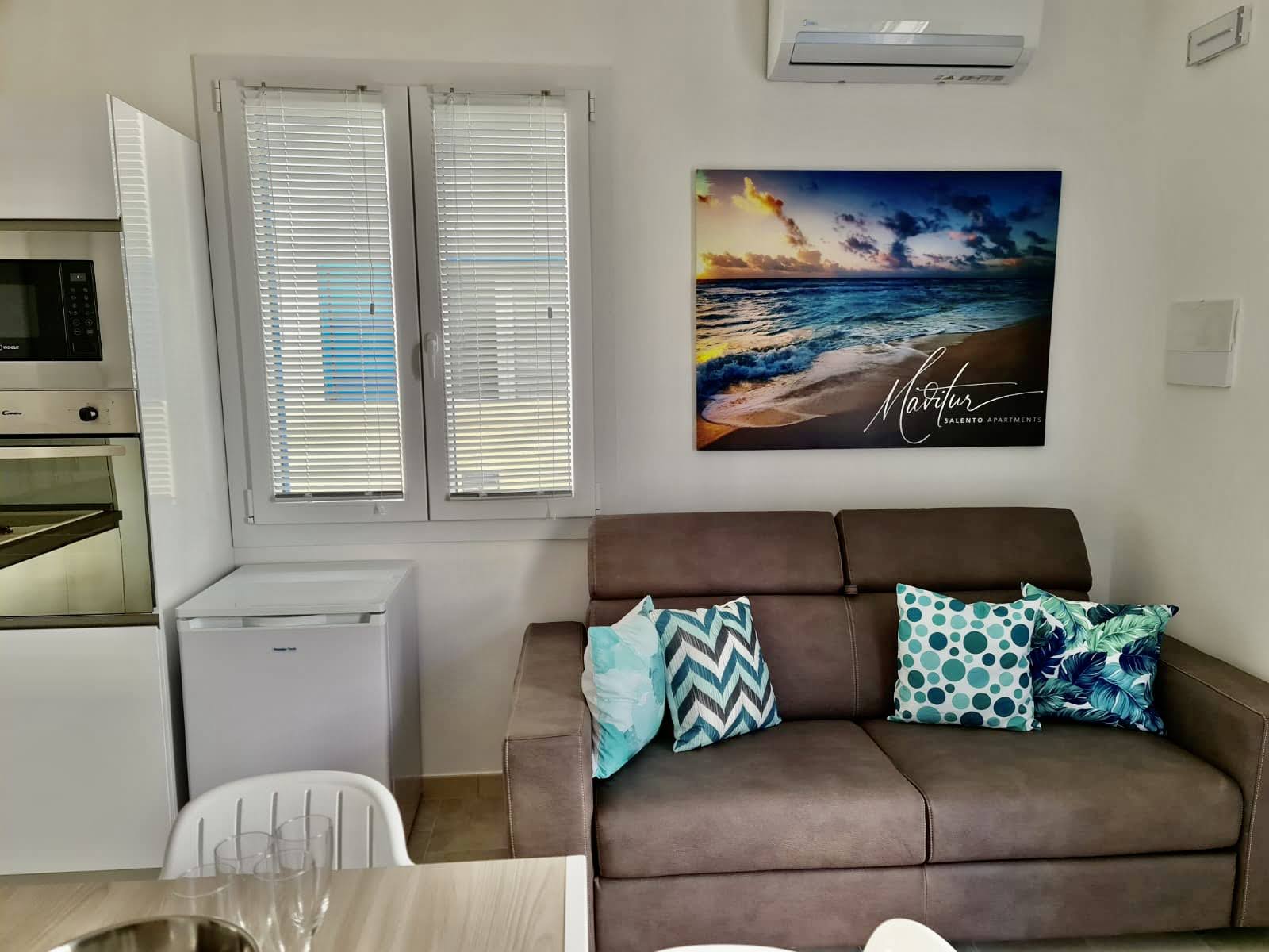 Offriamo in affitto appartamenti vista mare finemente arredati con ogni comfort, due camere da letto, soggiorno con divano letto e cucina completa, un bagno con doccia, parcheggio privato, aria condizionata, SMART TV 55" e WiFi situati di fronte all'Isola Pazze del Parco Naturale Regionale del Litorale di Ugento LE.
